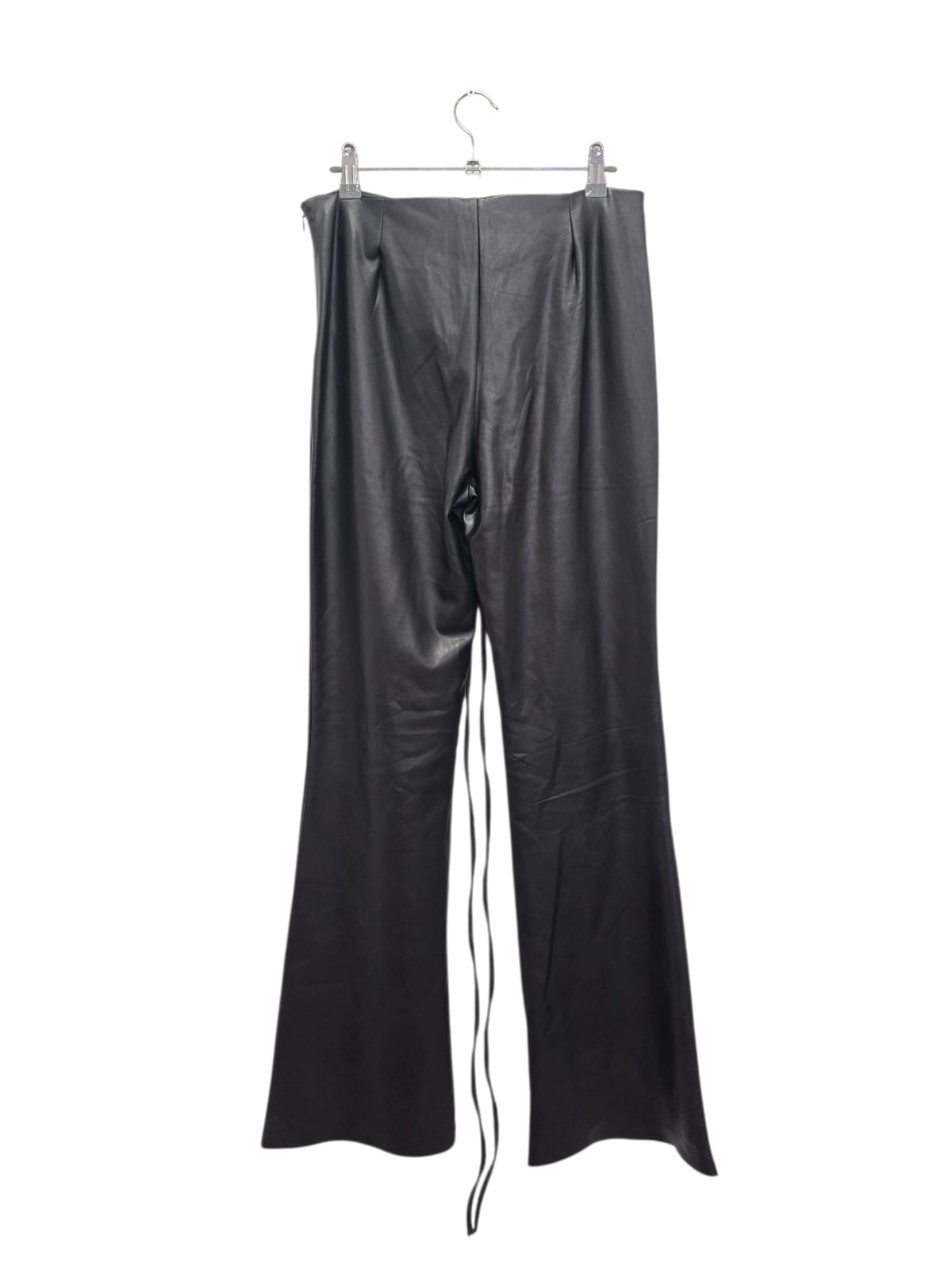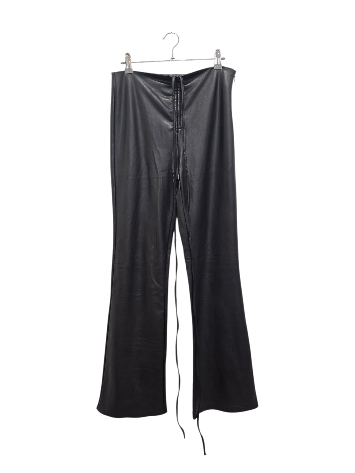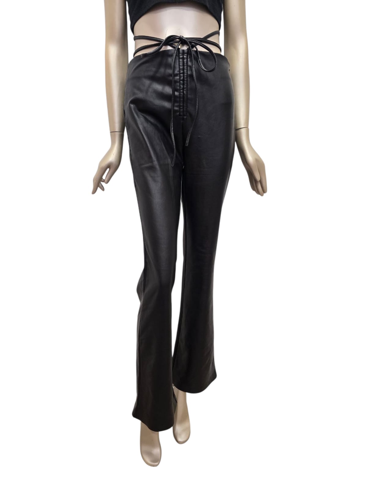 Calças em pele sintética com tira de amarrar na cintura com perna á boca de sino