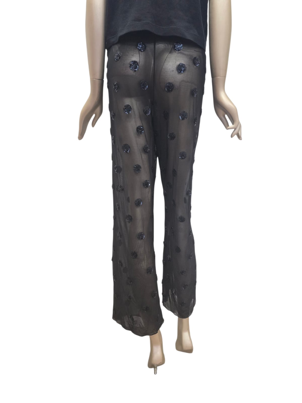 Calças em tule de perna larga preta com padrão de bolas em lantejoulas com reflexos azul petróleo, cintura elástica
