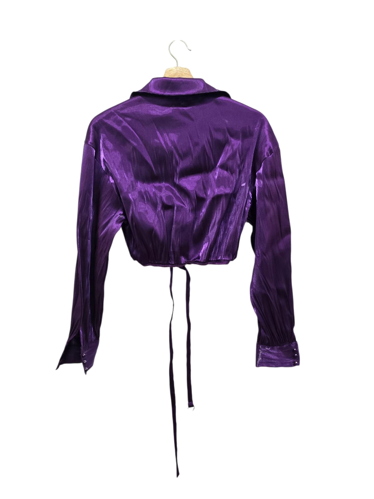 Camisa em tecido roxo extra brilhante com botões frontais estilo croped, coleção Show Up