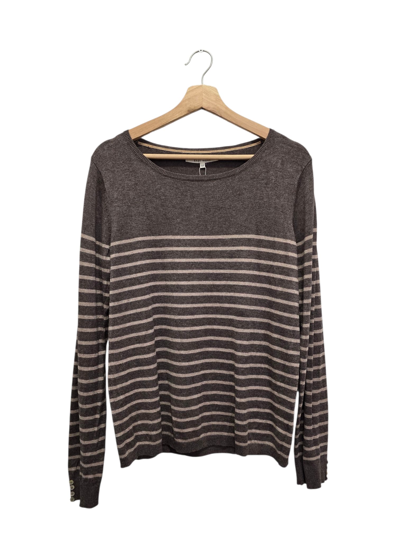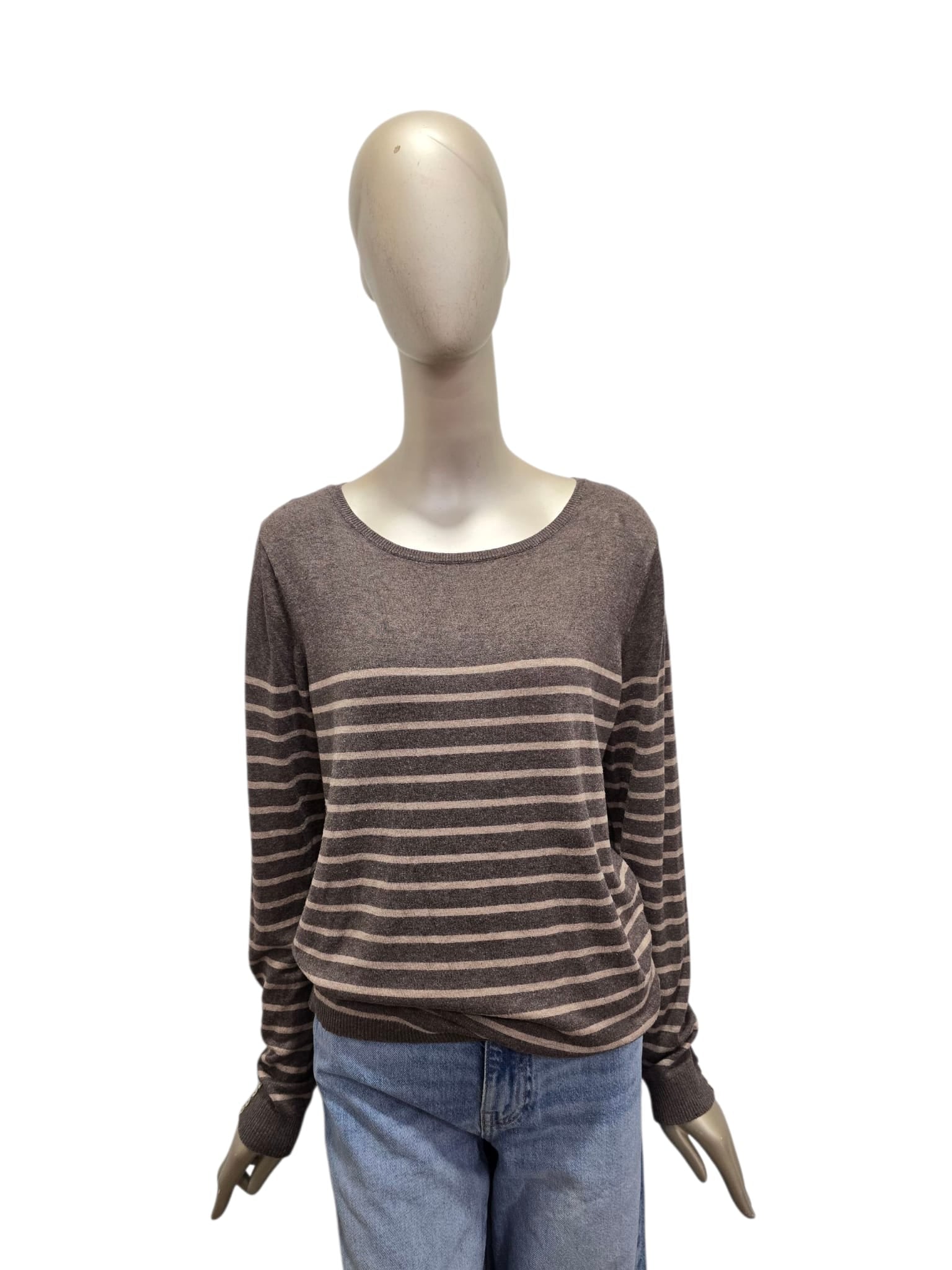 Camisola em malha fina castanha com riscas beges e botões nos punhos