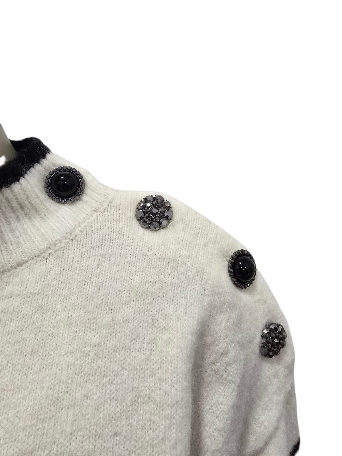 Camisola em malha grossa branca com riscas pretas horizontais e botões no ombro