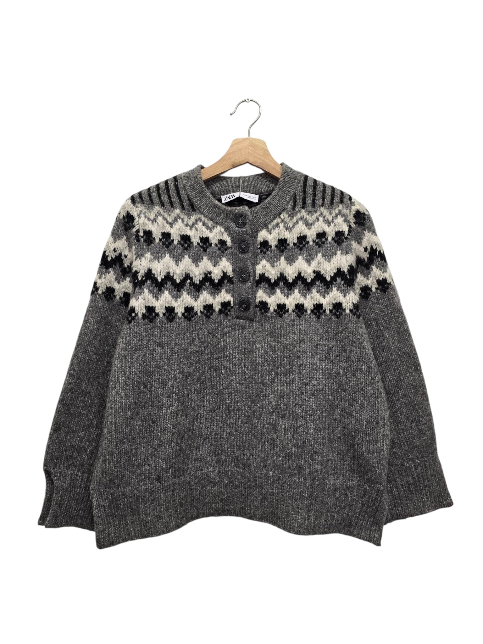 Camisola em malha grossa cinza preta e branca com botões no decote