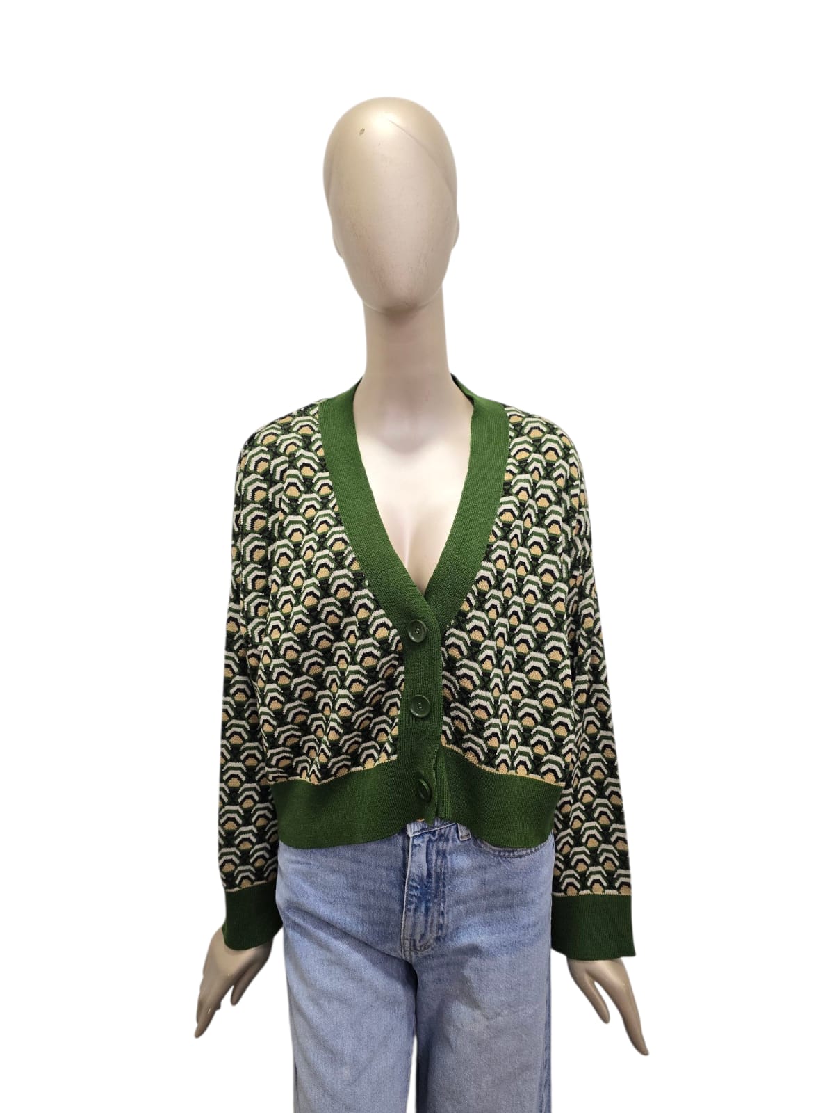 Cardigã padronizado em tons de verde, amarelo, branco e preto