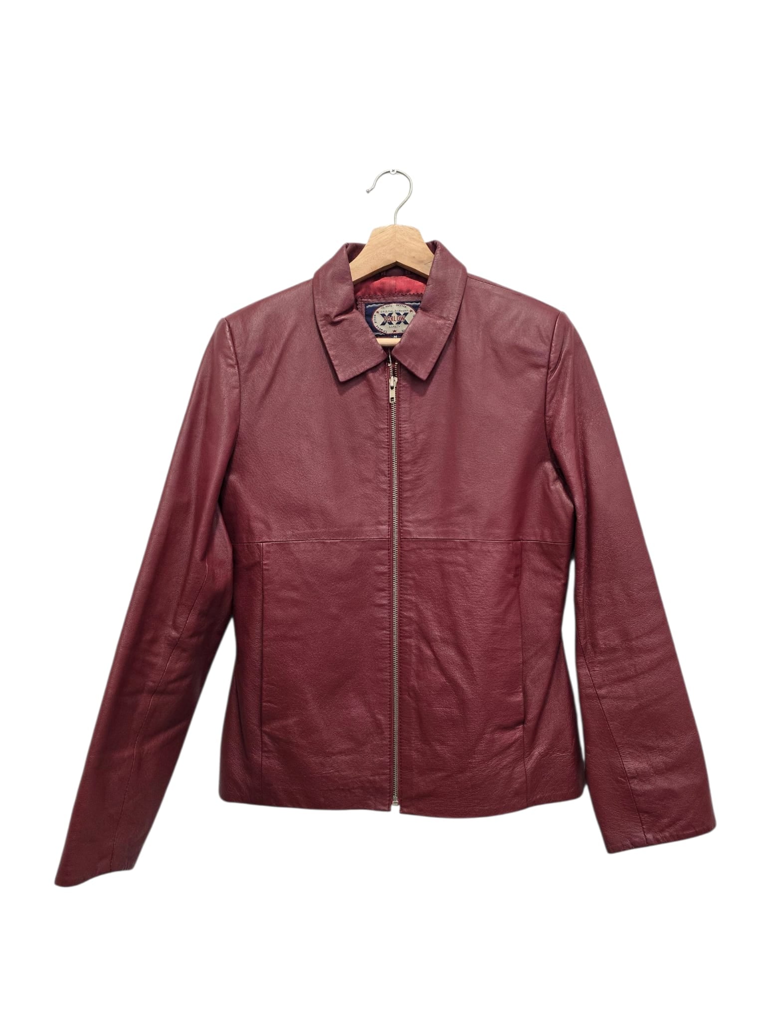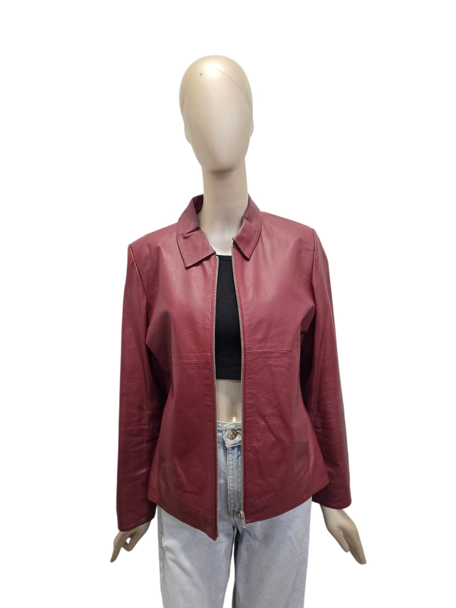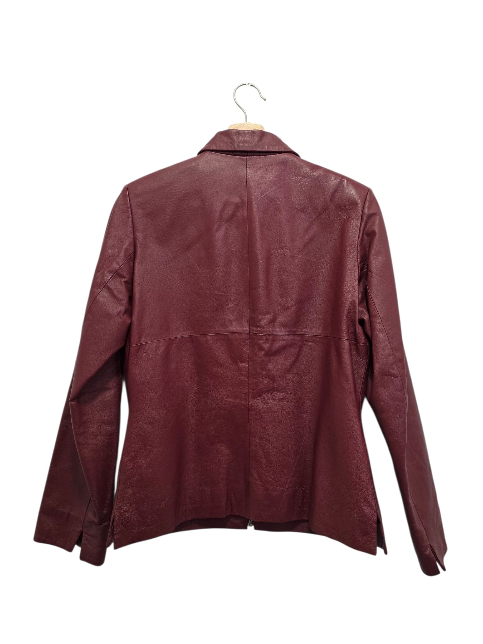 Casaco em pele genuína bordeux cintado com fecho frontal