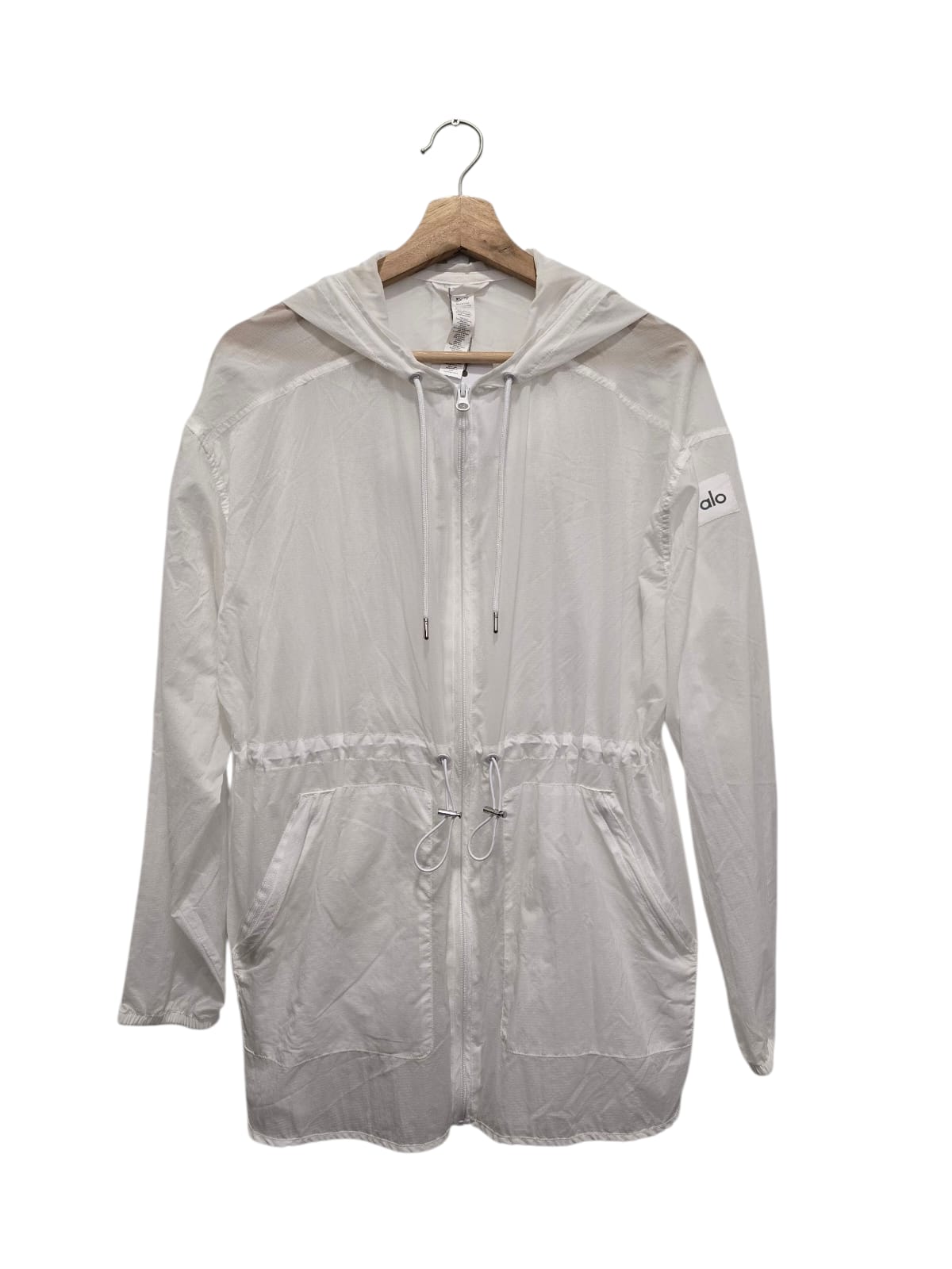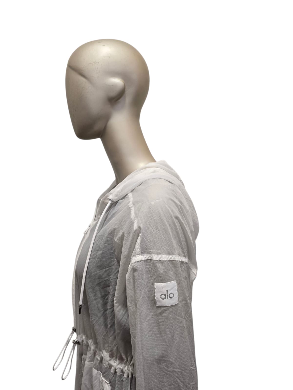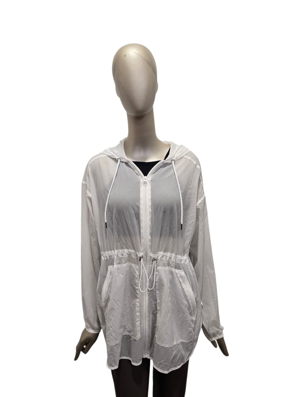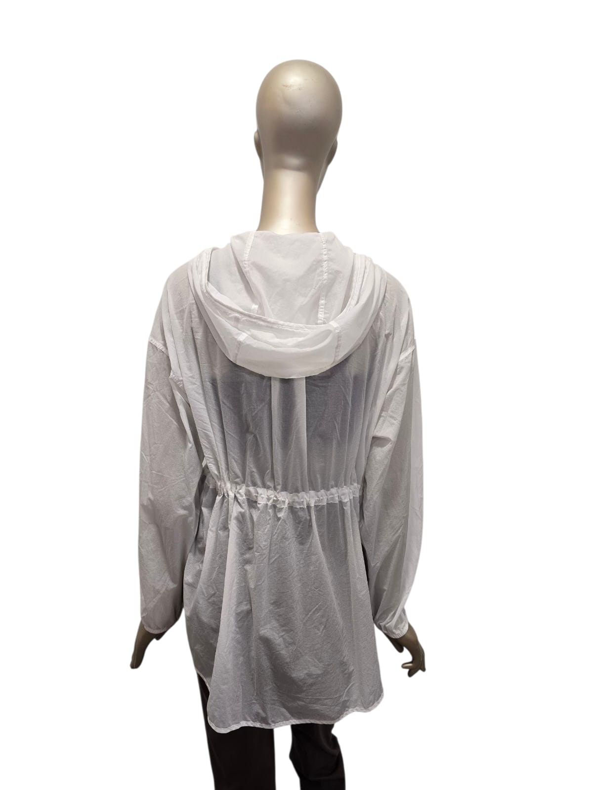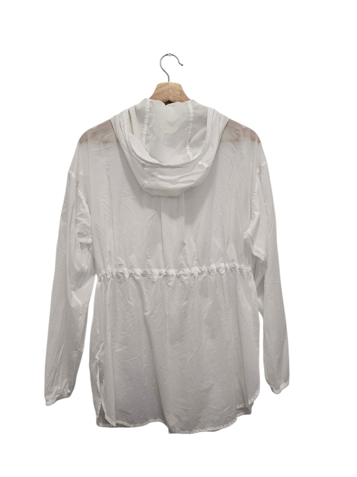 Corta vento branco com transparência, de ajustar na cintura e logo da marca no ombro