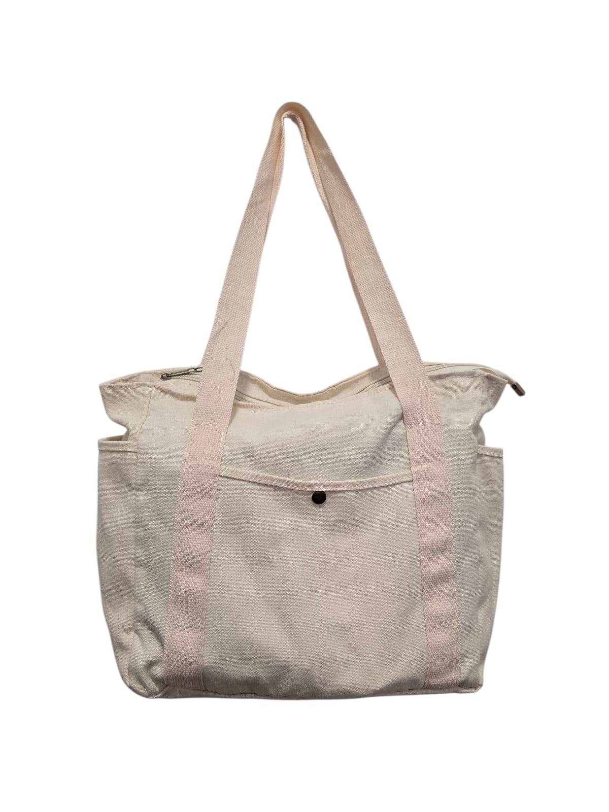 Mala em tecido creme com fecho superior e bolsos nas laterais