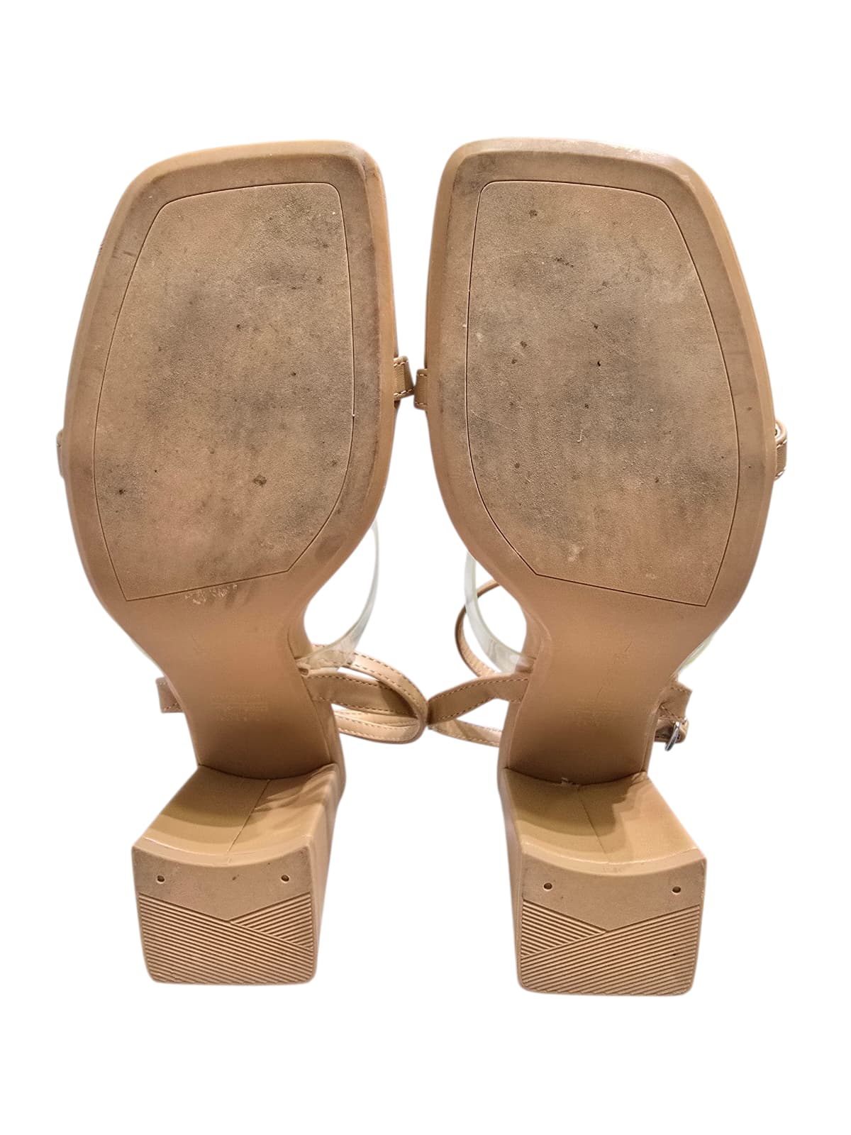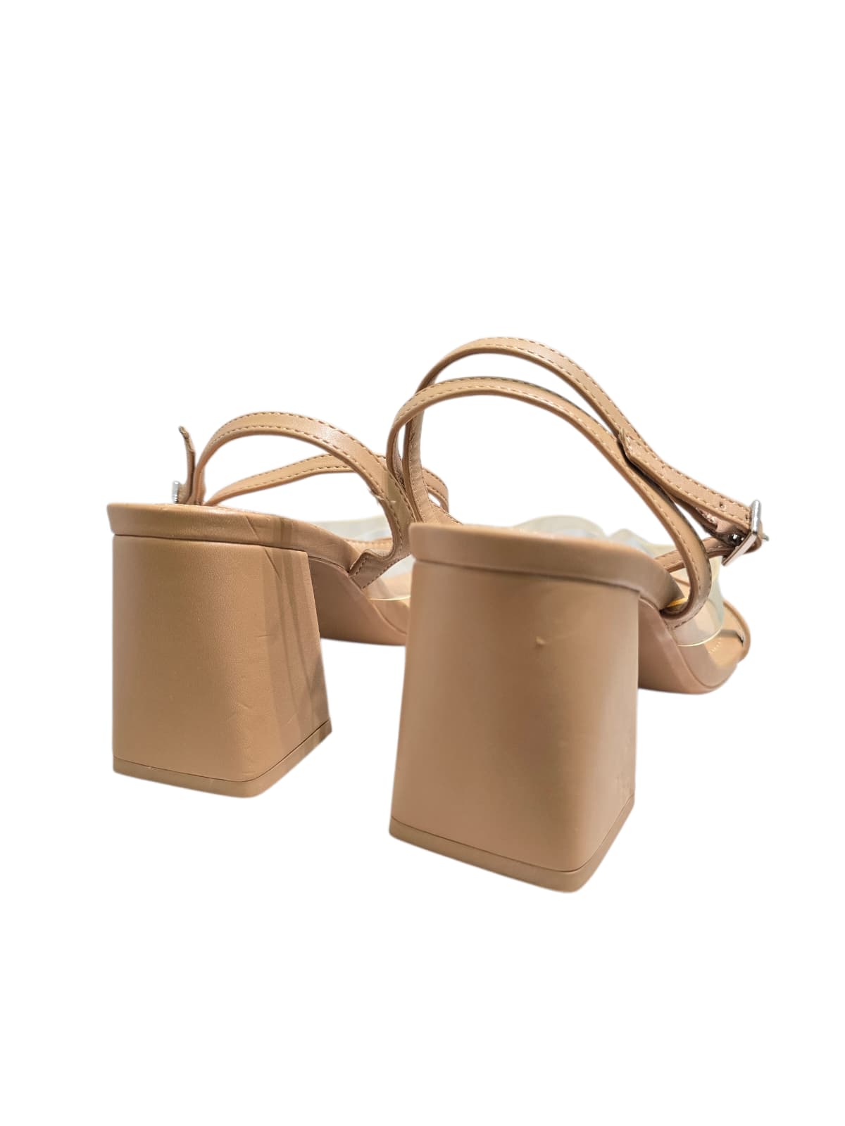 Sandálias em pele sintética bege com tiras e pormenores de transparência