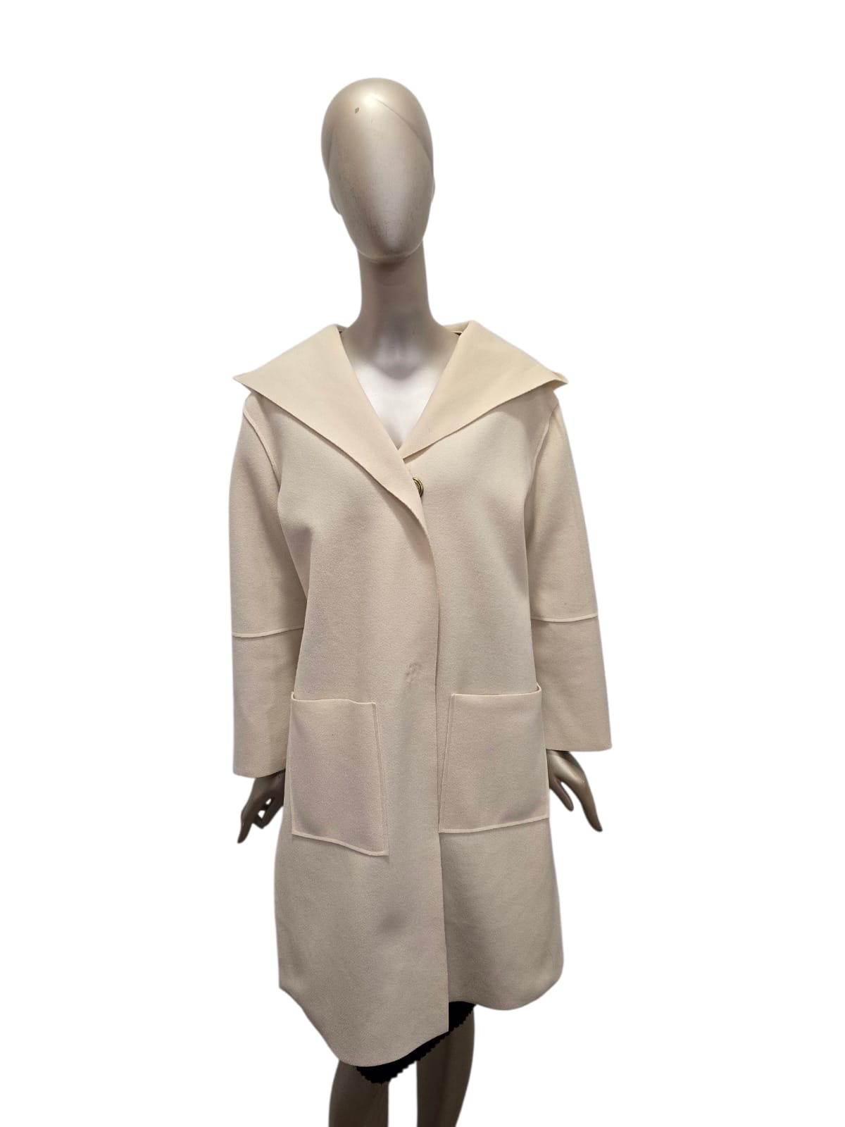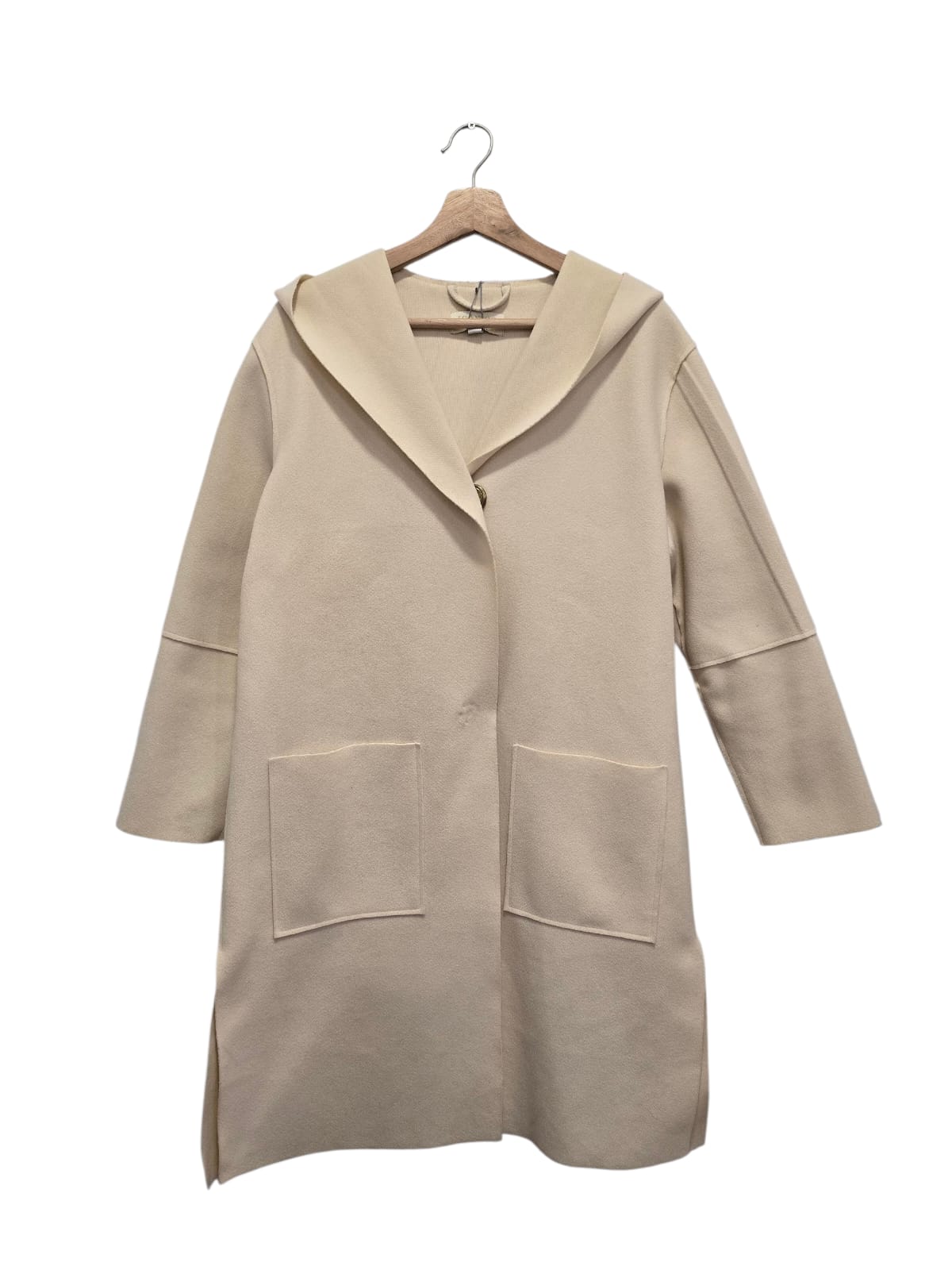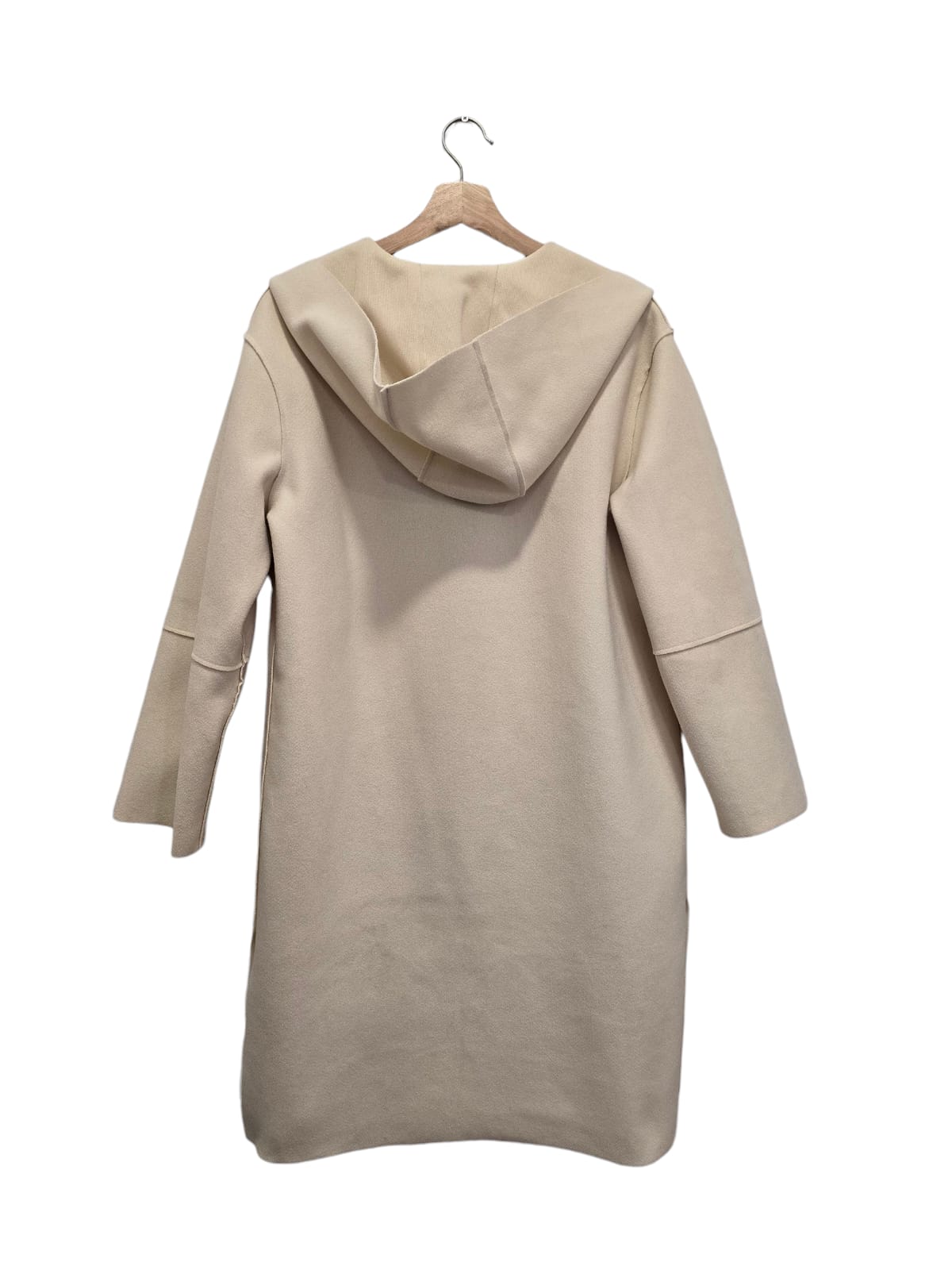 Sobretudo em fazenda fina creme com botões mola e capuz