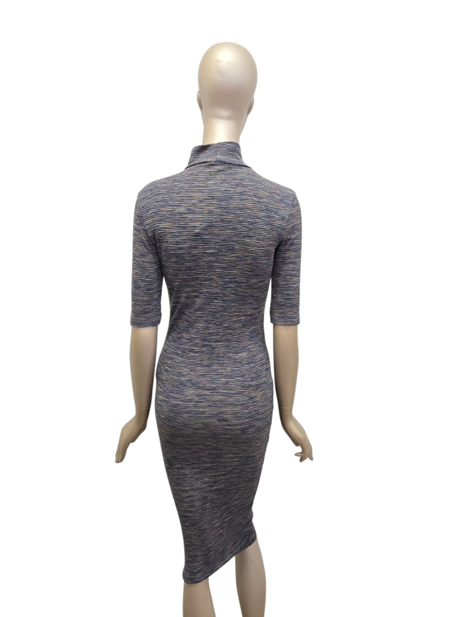 Vestido MAXI em malha canelada em tons azuis, cinza e salmão com meia manga