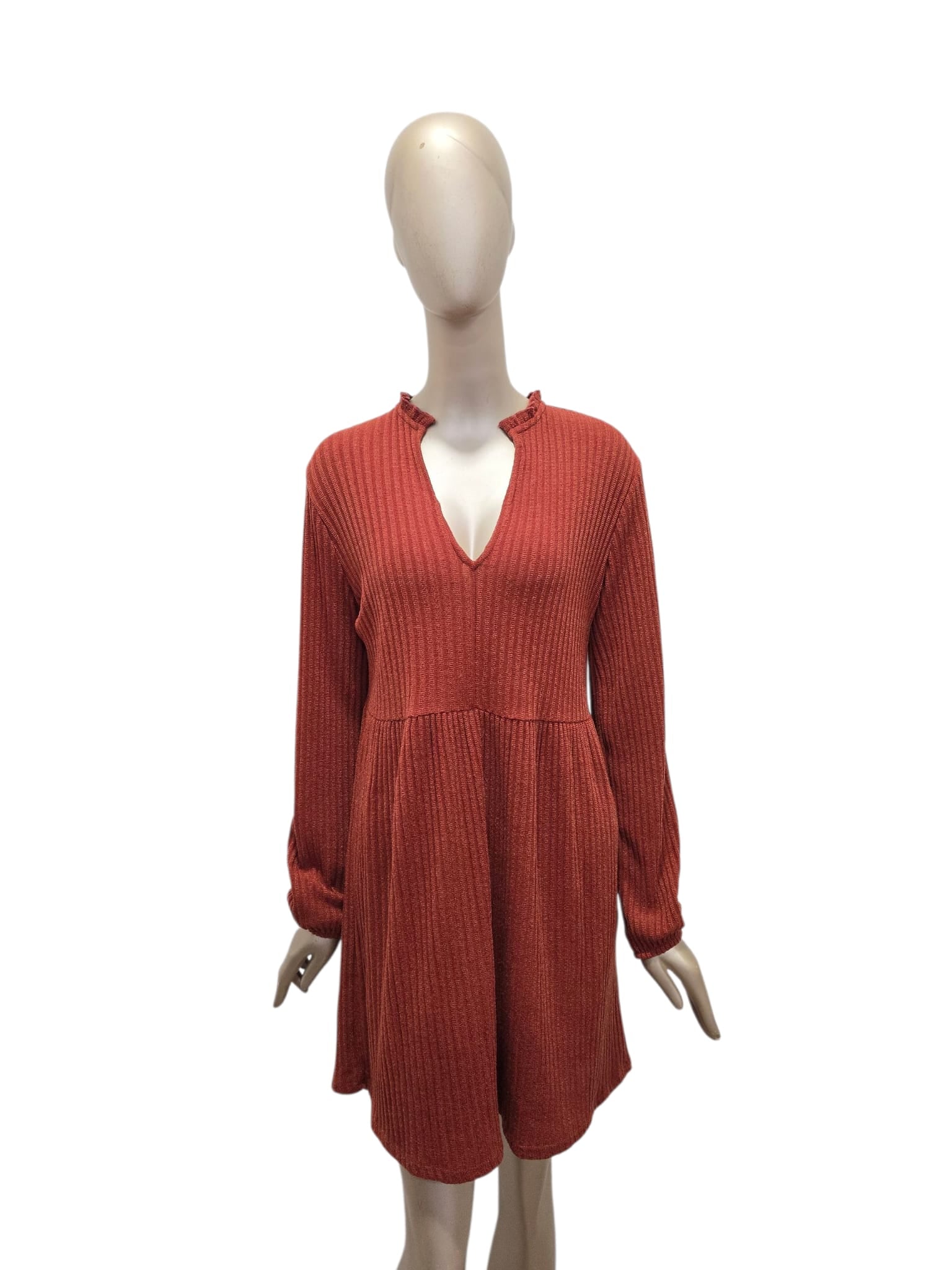 Vestido em malha canelada laranja tijolo, fluído com decote em V