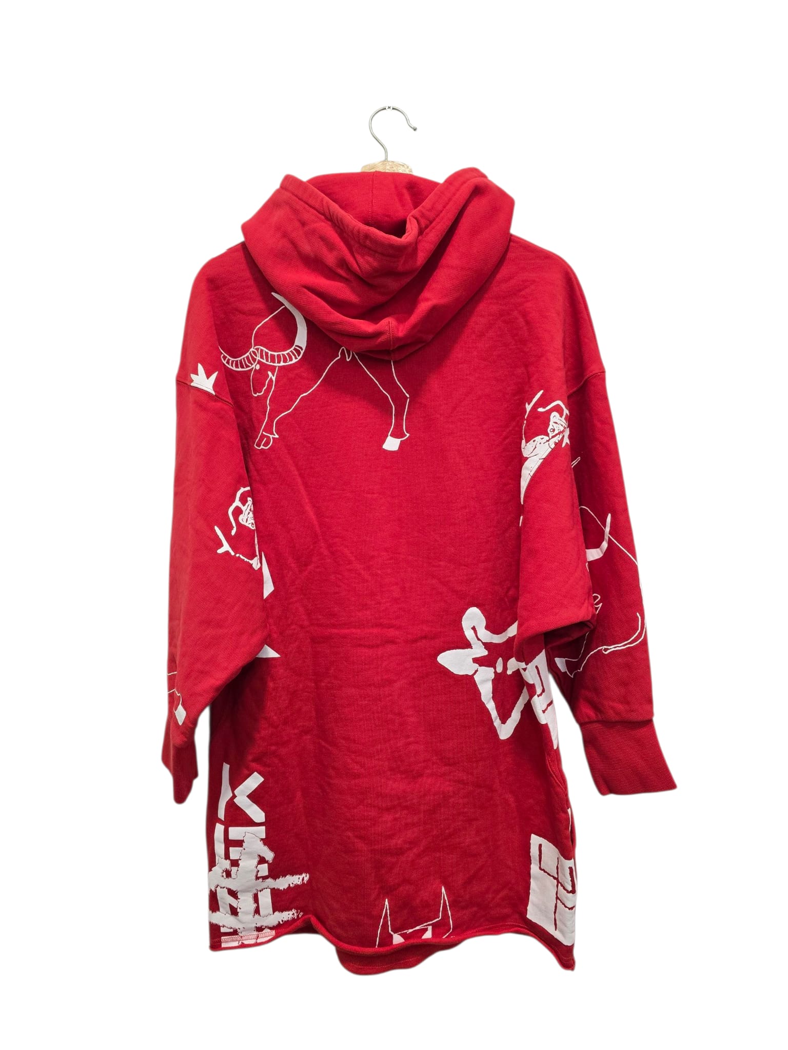 Vestido MINI em malha grossa vermelha com estampado branco, estilo Hoodie, coleção capsula ano novo do boi.
